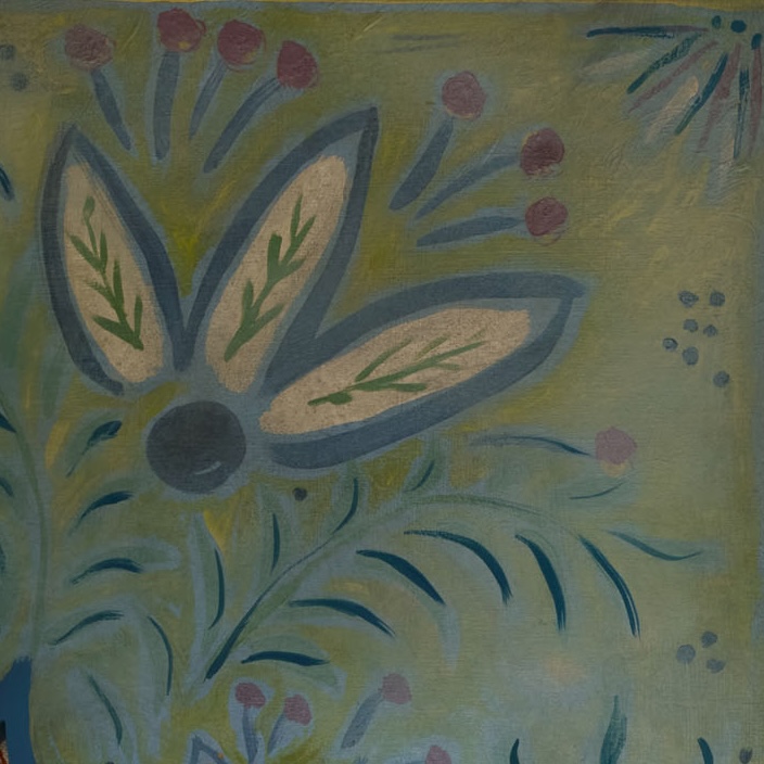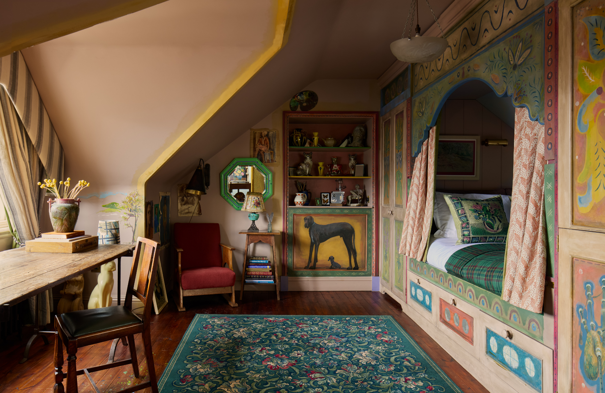 The design of the Artist’s Studio was conceived and art-directed by Neil Wenman, partner at Hauser & Wirth. The room carries many echoes of Charleston, with its hand-painted doors and joinery and cushions by the artist Cressida Bell, granddaughter of Vanessa Bell. The principal element in the space is the built-in box bed flanked by twin wardrobes and painted in the Bloomsbury manner, creating a cosy painted jewel box tucked into the eaves of the attic.